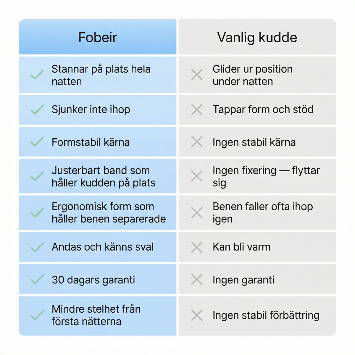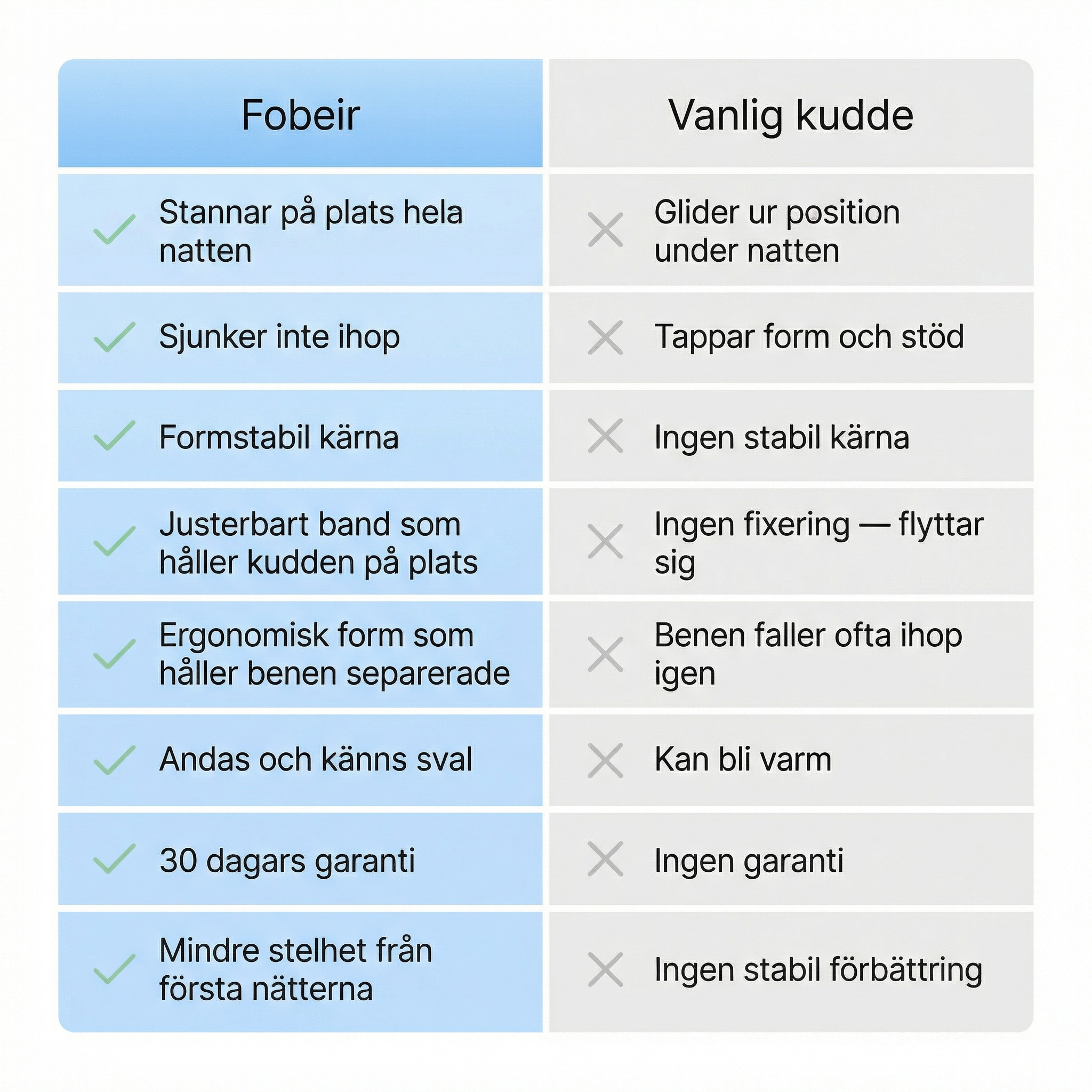 Fobeir stabiliserar benen och håller höfterna i linje genom natten. När kroppen får rätt stöd slipper musklerna kompensera — och belastningen fördelas jämnt.